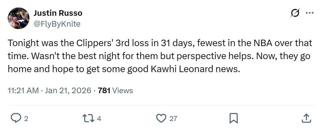 况且正如船记Justin Russo所说,本场比赛球队表现并不完美,但这也只是他们过去31天内的第三场失利,同期联盟最少,所以重要的是积极保持心态,回家后希望能听到关于小卡的好消息。